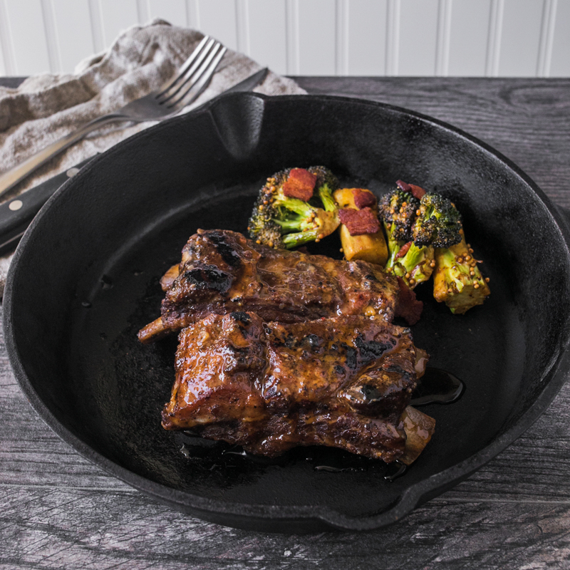 Apple-Glazed Barbecue Baby Back Ribs with Mustard-Roasted Broccoli with Bacon