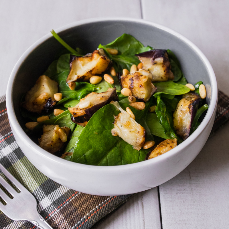 Baby Spinach with Grilled Eggplant, Feta and Pine Nuts