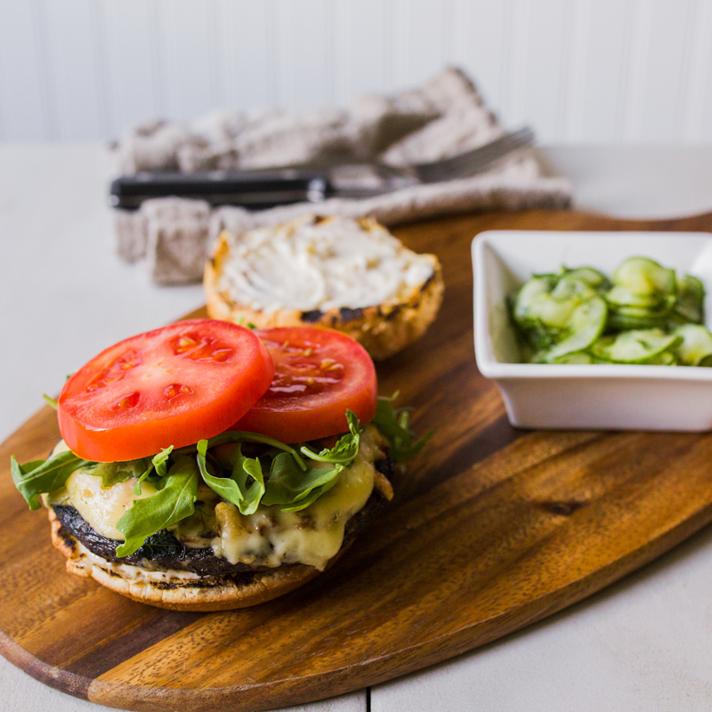 Cheese-Stuffed Portobello “Burger” with Sweet and Sour Cucumbers with Dill