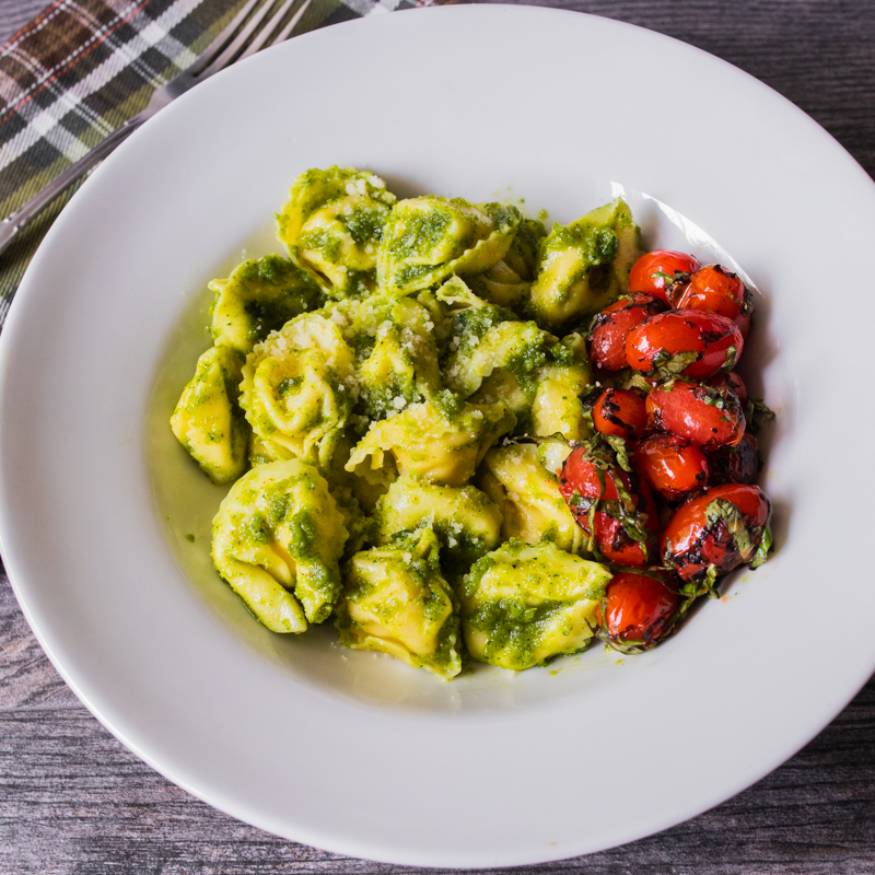 Cheese Tortellini with Walnut Pesto with Charred Cherry Tomatoes with Basil