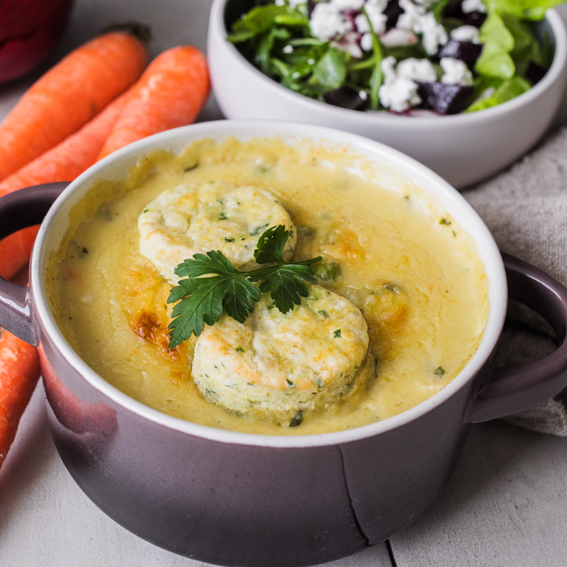 Tonight enjoy this southern comfort food classic chicken and biscuits. A creamy chicken stew filled with chunks of chicken, carrots, peas, pearl onions and celery all slowly simmered in a chicken stock base. The stew is served with our homemade biscuits. Think of a classic pot pie, but with not crust, just biscuits on the side. To accompany the stew we paired a mixed greens salad with roasted beets, tangy goat cheese and a citrus vinaigrette. One great option here is to save the salad for lunch the next day.