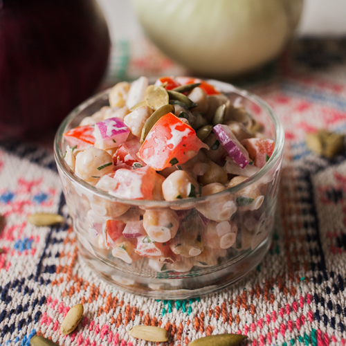Ingredients: chickpeas, tomatoes, parsley, mayo, red onion, lime, chipotle, cumin, pumpkin seeds