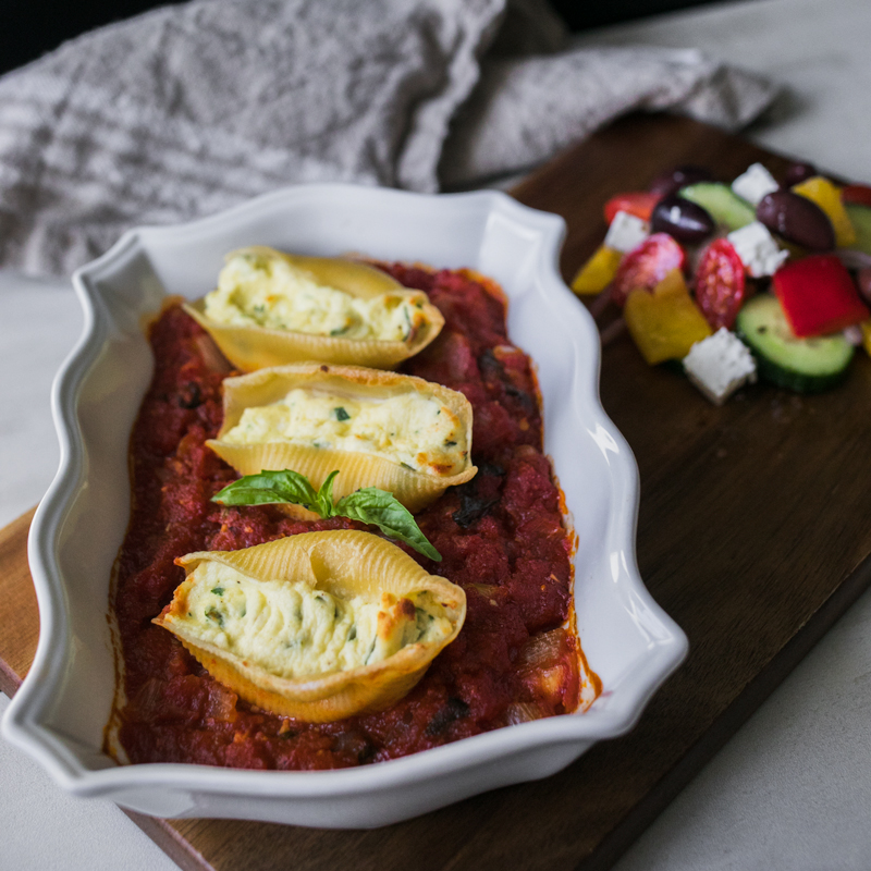 Feta and Ricotta-Stuffed Shells with Tomato-Basil Sauce with Greek-Style Vegetable Salad