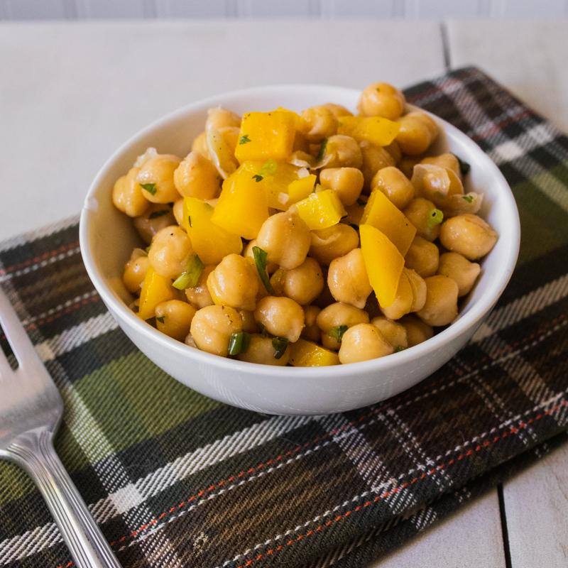 Here is the ideal side salad for you to bring to the next BBQ you have been invited to. This ginger cumin chickpea salad will be the talk of the party. Tender cooked chickpeas are combined with diced bell pepper and chopped cilantro; then the bean salad is tossed in a fresh ginger, toasted cumin, and lemon juice dressing. It is so bright and fresh, plus is has a bit of a bite to it because of the fresh ginger. We enjoy this bean salad with pulled pork, smoky ribs, or grilled lamb chops. Yum.