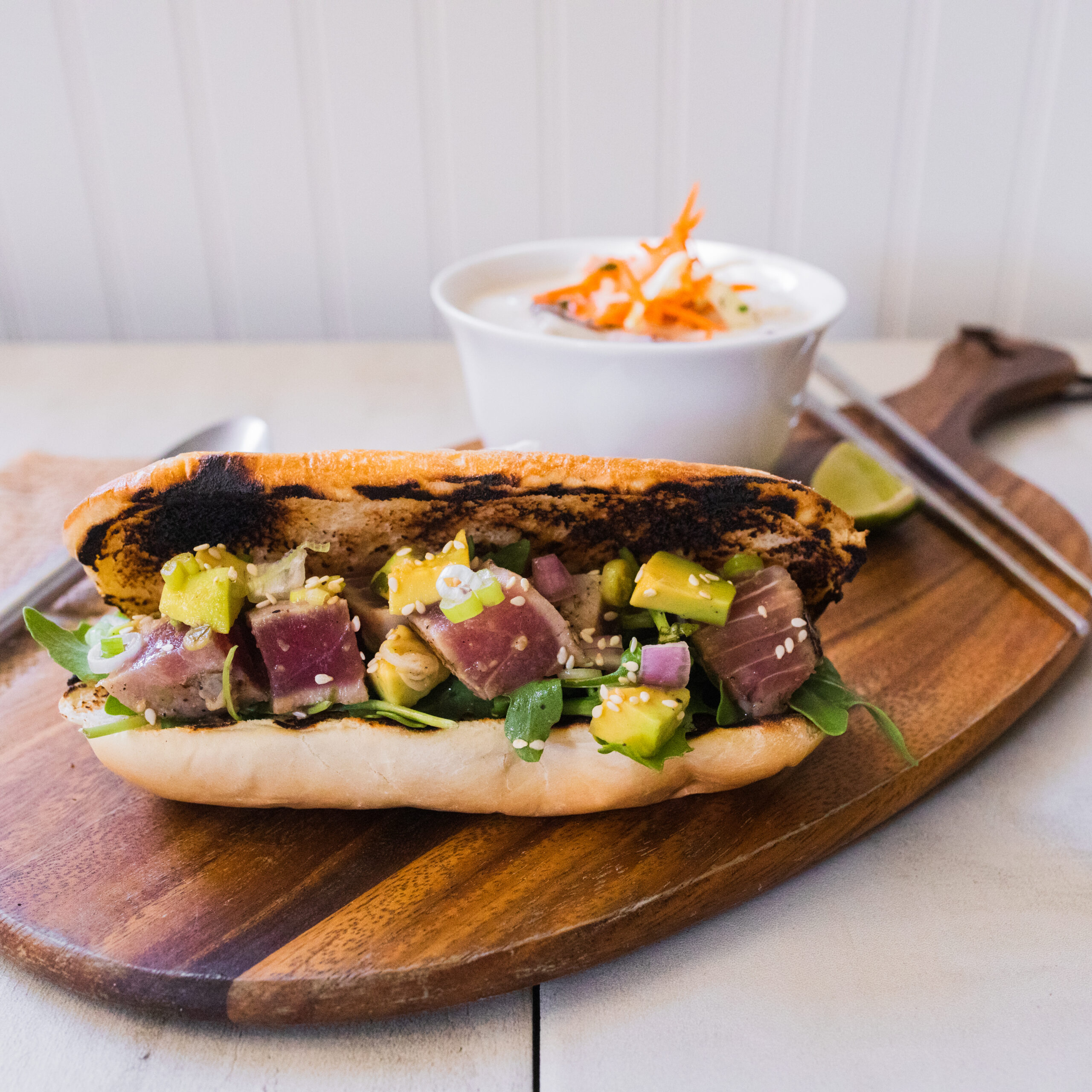 We took inspiration from an East coast classic lobster roll when this dish was created and yes, it does have an Asian flare to it. Ahi tuna steaks are quickly char-grilled, diced and then folded into a soy sauce, lime juice, and wasabi sauce. Next shaved red onion, creamy diced avocado and scallion are combined with the grilled tuna. Place the tuna salad in the roll top with arugula and you are good to go. The tuna roll is paired with our Thai-style coconut soup. In each spoonful you will find diced eggplant, mushrooms, carrots, shredded cabbage, tomato and onion; all simmered in a vegetable stock. The soup is seasoned with green curry paste, coconut milk, fish sauce, palm sugar and lime. Think of this soup like a veggie tom ka. No chicken but it sure has a lot of veggies. Don’t forget to garnish each serving with fresh cilantro.