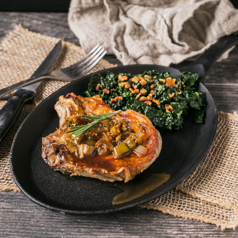 Be the first to review “Honey-Balsamic-Glazed Pork with Sauteed Kale with Bacon