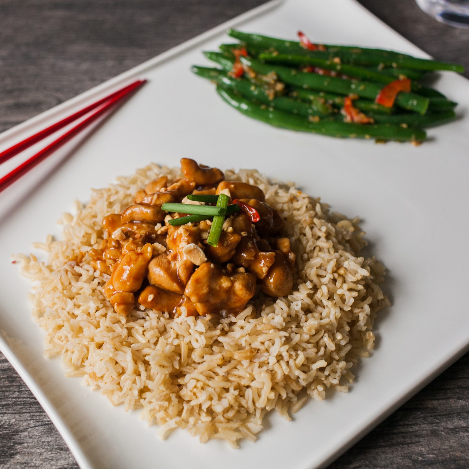 Kung Pao Chicken over Steamed Rice with Sauteed Green Beans with Soy, Shallots, Ginger and Garlic