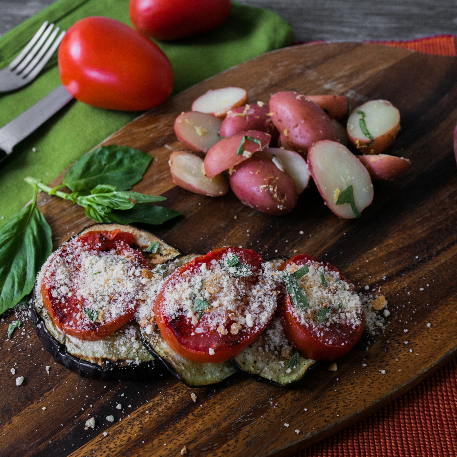 Parmesan and Basil-Crusted Grilled Eggplant and Tomatoes with Lemon-Basil Potatoes