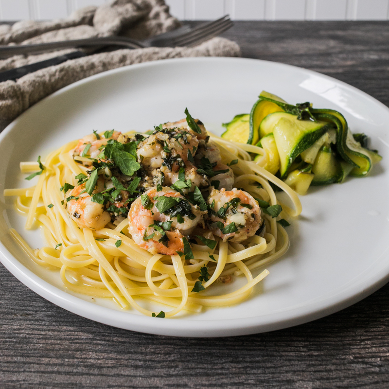 Stay in tonight and enjoy a bowl of pasta with shrimp scampi and a nice glass of wine. Well, we have you covered for one of the two items. Top your pasta with shrimp sautéed with red pepper flakes, minced garlic and black pepper then deglazed with dry white wine and finished with butter. This shrimp pan sauce is elegant and has a touch of heat to it. But, we all know how delicious it is. The pasta is paired with tender sautéed zucchini seasoned with lemon and fresh basil. When you take a bite of this meal, close your eyes and you will be whisked away to the coastal city of Camolgi.
