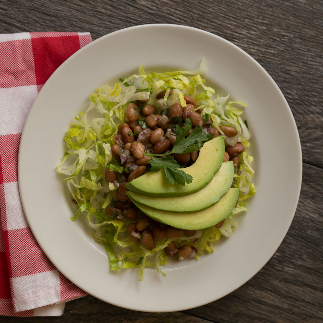 A light, but filling bean salad is ready for your Cinco de Mayo week. This bean salad is ideal for a light lunch or a snack. It is made up of fork tender pinto beans, diced red onion, cilantro, avocado, cumin, lime juice, and olive oil. The medley of beans sits on a bed of shaved iceberg lettuce.