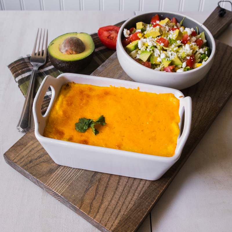 Change up your menu this week with our polenta tamale pie. This based casserole starts out with ground beef being sautéed with salsa and refried beans; then seasoned with chili power and cumin. The seasoned ground beef mixture is then topped with polenta and cheddar cheese before it is baked. Once the cheese has melted the pie is ready to serve. Each bite is jam packed with beef, salsa, polenta and cheese. You may even want a tortillas chip to dunk in it. We paired a Mexican-inspired chopped salad with the tamale pie. The salad is made up of chopped romaine, tomatoes, cabbage, jicama, corn, avocado, and feta. It is then topped with a tomatillo, cilantro, jalapeno and lime juice dressing. Zippy, fresh and delicious. Together this duo is ready to take on dinner or lunch any day of the week.