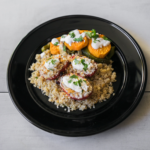 You are one click away from amazing quinoa risotto meatless meal. Yes, we prepare the quinoa in the style of “risotto” by cooking it with sautéed shallots and garlic then seasoning it with crème fraiche, lemon zest and parmesan. The quinoa is topped with panko bread crumbs, roasted tomatoes and more parmesan. It is served alongside roasted sweet potatoes and peppers. Together these two items make for one amazing meal you can sit down to and catch up on your favorite TV show. You can even break it up into two smaller meals if you wish.