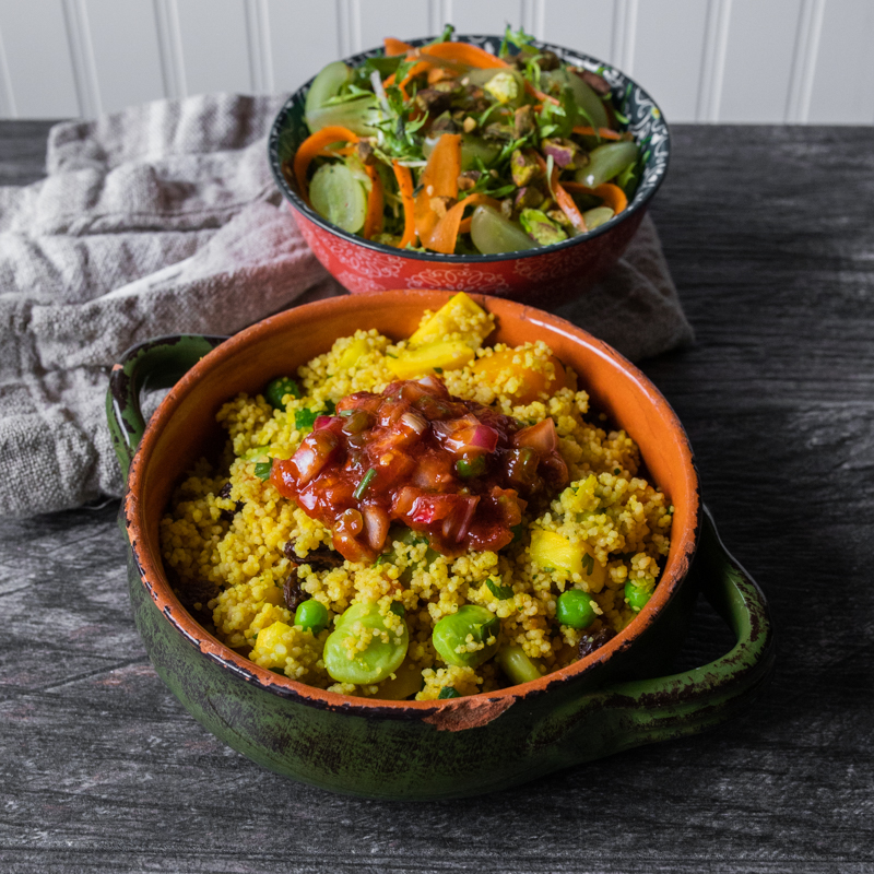 Seven-Vegetable Couscous with Onion Harissa with Frisee and Carrot Ribbon Salad with Grapes and Pistachios with a Za’atar-Lemon Vinaigrette