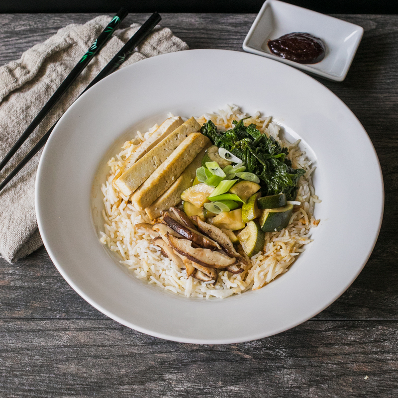 Tofu Bibimbap with Greens and Zucchini over Steamed Rice