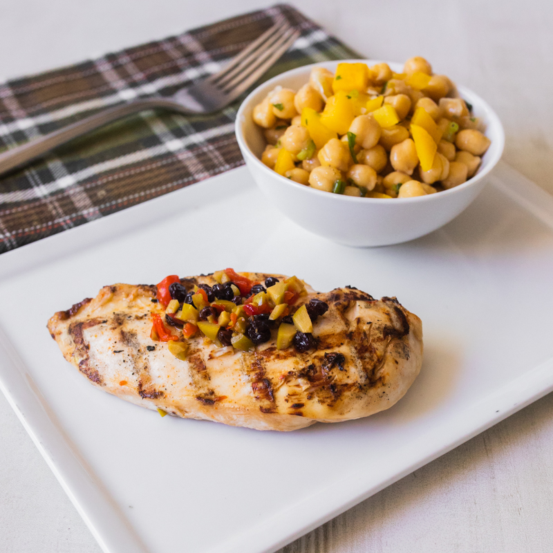 Tunisian-Style Chicken with Currants and Olive Relish with Ginger-Cumin Chickpea Salad with Cilantro