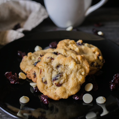 Bet you can’t just eat one of these delicious cookies! Each of these chewy rich soft cookies you get bits of dried cranberries, white chocolate chunks, and macadamia nuts. These ingredients are folded into a brown sugar butter dough. Oh so good! These cookies are ideal for any coffee or tea dunking experiment at home or in the office. We are not over the holiday cookie craze. We love them too much.
